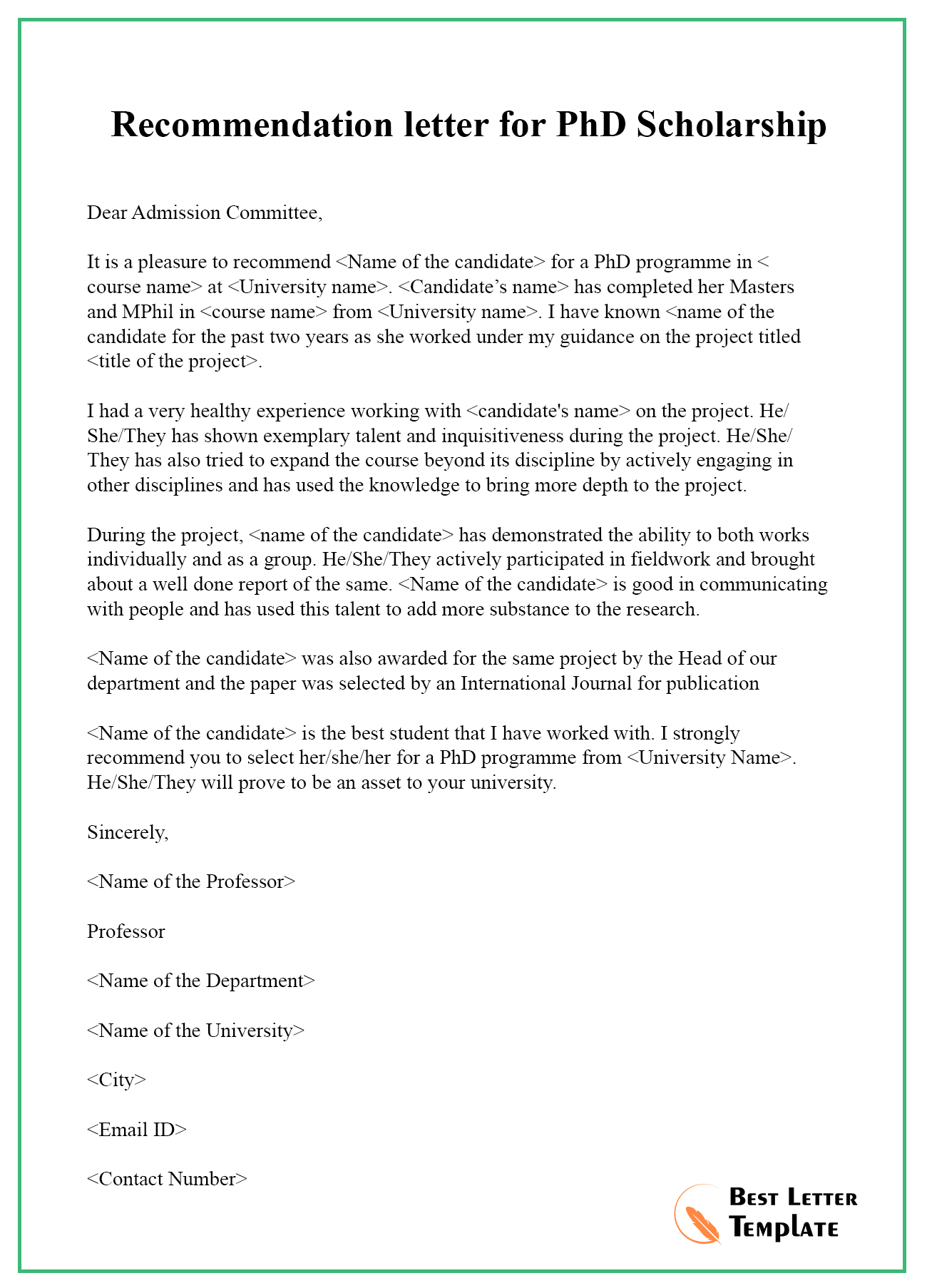 Recommendation Letter For Phd Student Template Wor…